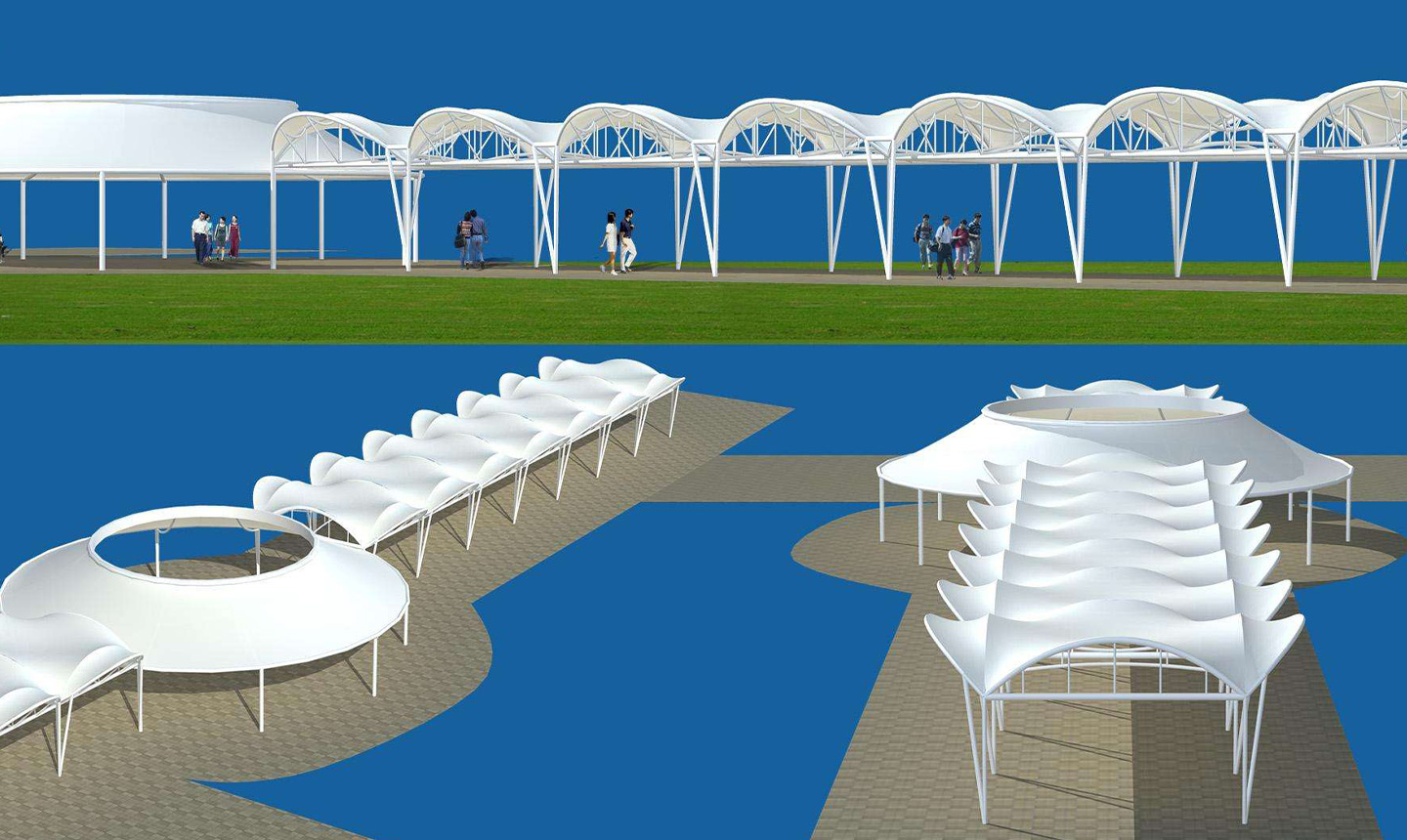 對于膜結(jié)構(gòu)建筑來說,首先要發(fā)揮抵御各種天氣現(xiàn)象的作用,比如說自然現(xiàn)象的日曬雨淋等會對建筑結(jié)構(gòu)有的內(nèi)部空間造成的影響,還要保持建筑物內(nèi)部人們生活環(huán)境的舒適度。在使用這樣的材料建筑的時候,我們要考慮好選擇什么樣的材料來應(yīng)對當(dāng)?shù)剌^普遍的天氣的狀況。對于室內(nèi)的透光性以及很好的通風(fēng)的效果,也是張拉膜景觀設(shè)計的較為突出要在意的一點。