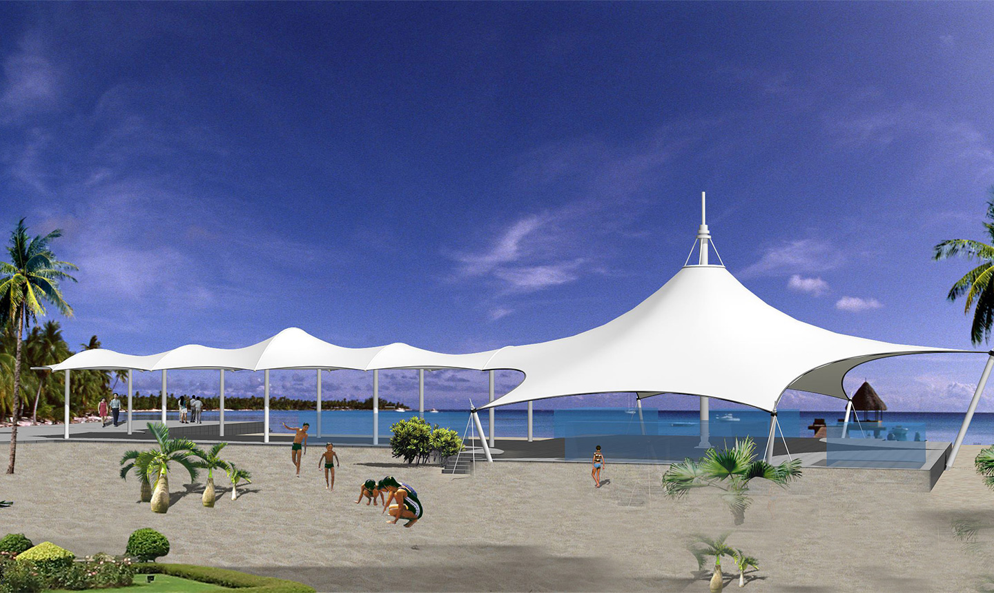 膜結(jié)構(gòu)由于其材料重量輕、支撐方式靈活的特點使其形狀變化多端,使設(shè)計者能夠充分發(fā)揮空間想象。大部分膜結(jié)構(gòu)工程的造型是非常活潑漂亮的,膜結(jié)構(gòu)工程不但打破了傳統(tǒng)建筑形式的沉悶,而且非常具有張力和雕塑感,能展現(xiàn)建筑形式的現(xiàn)代氣息,與傳統(tǒng)建筑的多線造型相比,膜結(jié)構(gòu)工程建筑以其優(yōu)美的曲線造型吸引人,與周邊建筑相輔相成的同時也讓人眼前一亮。特別是大型地標利用奇特的膜結(jié)構(gòu)造型營造夢幻般的夜間景觀效果,增加其認知度和商業(yè)效果。